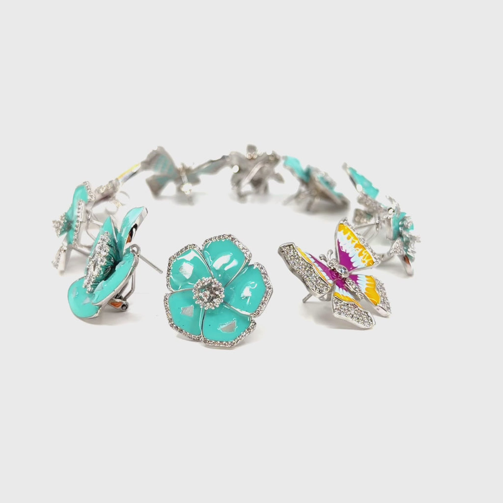 Turquoise enamel flower earrings with Swarovski electroplated in White Gold